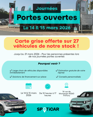 Vous recherchez un véhicule d’occasion fiable et garanti dans le Loiret ? Les 14 et 15 mars 2026, le Garage Lagarde à Thimory vous ouvre ses portes pour les Journées Portes Ouvertes Spoticar, de 10h à 17h. Deux jours exceptionnels pour découvrir nos véhicules et profiter d’offres uniques.